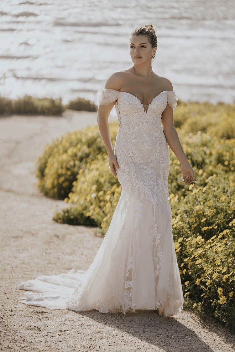 Curve-hugging sequined appliques, along with symmetrical pearled beadwork, adorn this off-shoulder sheath bridal gown