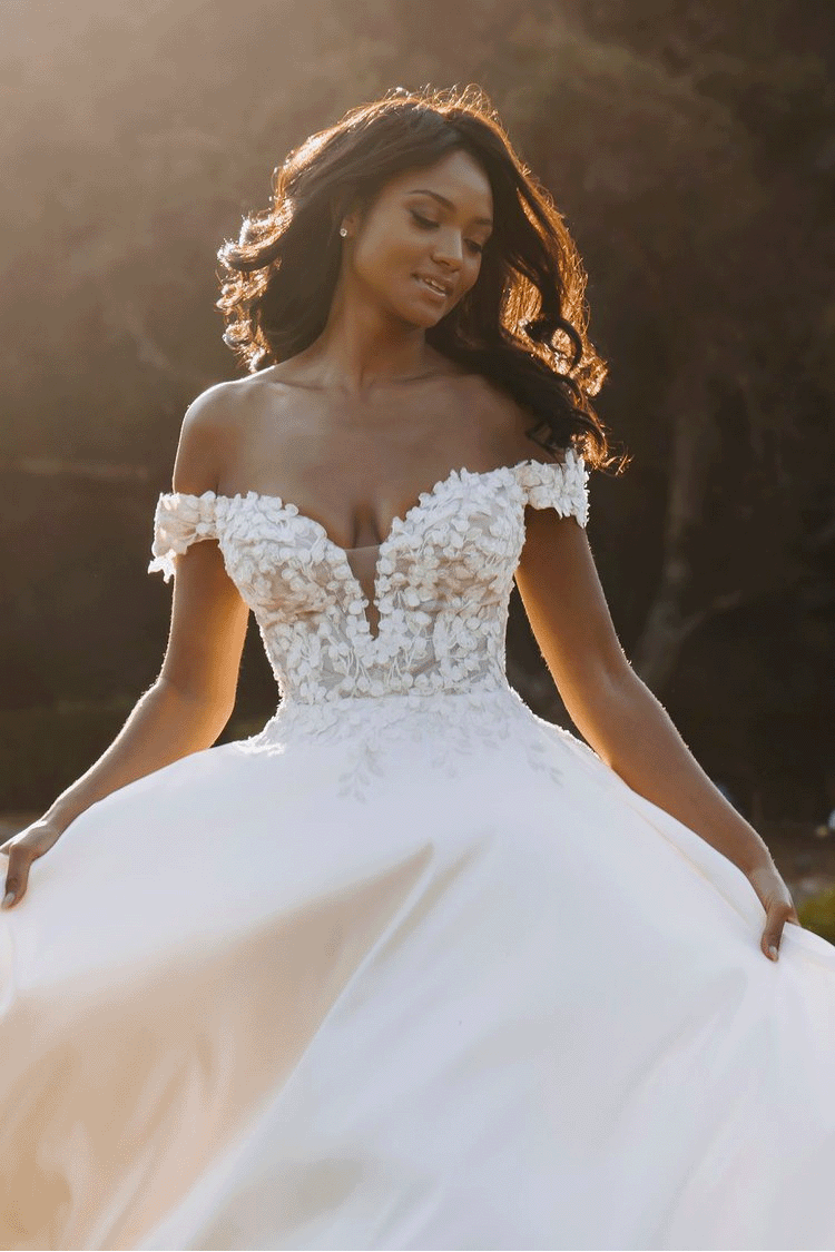 This off-shoulder ballgown is a dream come true, with a shimmering satin finish complemented by a textured bodice featuring metallic threading and dimensional appliqués.