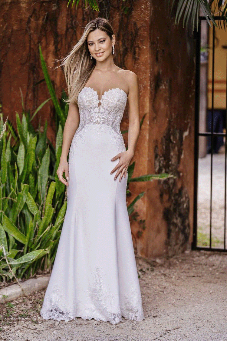 A figure-skimming crepe composes the skirt and train of this lovely strapless number.