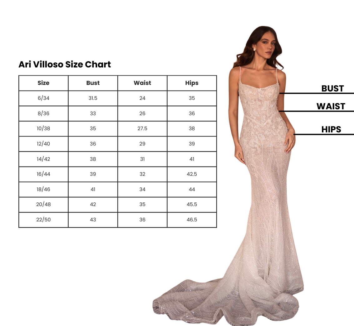 Please Note: This is a general size chart for all of the styles in this designer's collection, every style is NOT necessarily available in every size.
