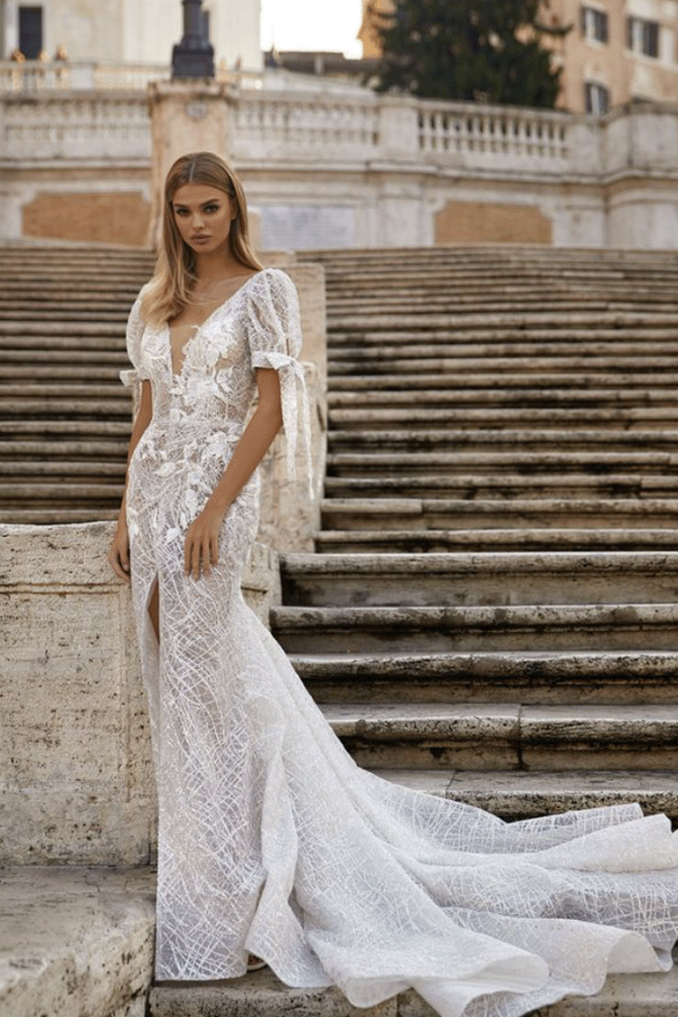 An ivory semi-transparent mermaid gown adorned with sequins and rhinestones. The gown features puffed sleeves with bow‑straps, a plunging V-neckline, and a centered slit on a skirt.